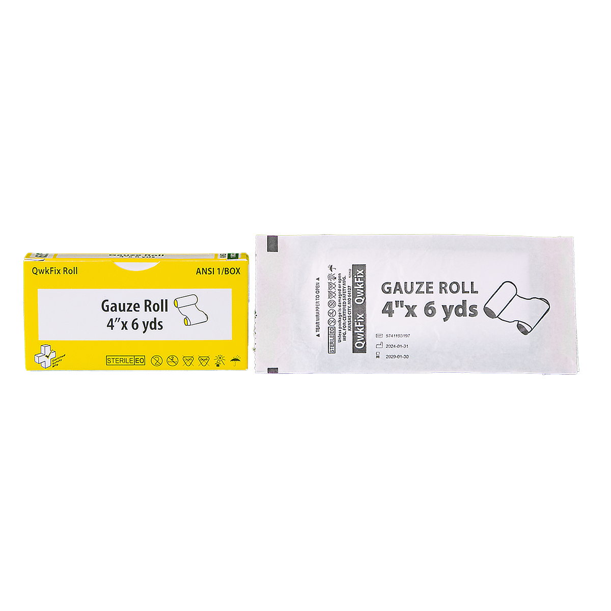 Sterile 4 in. x 6 yd. gauze roll suitable for use in ANSI Z308.1-compliant first aid kits. Provides secure wound coverage, helps control minor bleeding, and holds dressings in place.